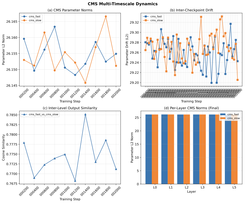 Figure 1: CMS dynamics across training. (a) Parameter norms remain nearly identical between fast and slow levels. (b) Inter-checkpoint drift is similar for both levels. (c) Cosine similarity between fast and slow level outputs averages 0.77, indicating high redundancy. (d) Per-layer norms show uniform behavior across all 6 layers.