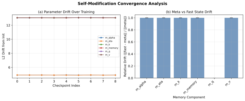 Drift from initialization. We track 84 self-modification parameters across 6 layers and 6 memory components. Large weight matrices show substantial L2 drift (≈13) from Kaiming initialization, while smaller components drift by ≈0.8. Critically, this drift occurs within the first 200 training steps and remains essentially flat thereafter. This suggests self-modification functions as a learned initialization offset rather than continual online adaptation.