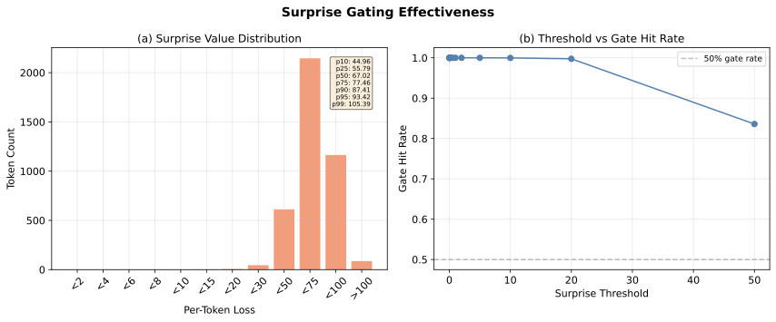 The surprise gate is effectively a no-op. For this mechanism to be meaningful, it would require either (a) substantially larger models where some tokens genuinely have near-zero loss, or (b) a relative rather than absolute surprise metric. In its current form, every token is "surprising."