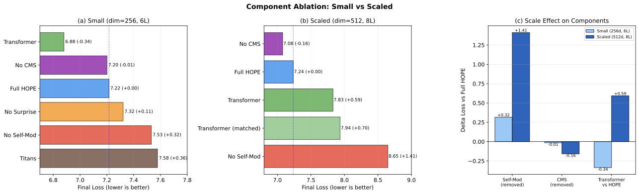 Figure 4: Component importance across scales. (a) Small-scale ablation. (b) Scaled ablation. (c) Scale effect comparison showing self-modification importance grows 4.5x, while the Transformer-HOPE reversal shifts from -0.34 to +0.59.