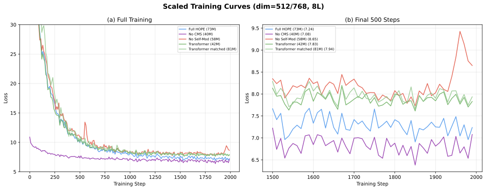 The parameter-matched comparison is particularly informative. A Transformer with 81.2M parameters (exceeding HOPE's 73.1M) achieves loss 7.936 — worse than HOPE's 7.237. Increasing Transformer capacity does not replicate the benefit of self-modification, confirming that HOPE's advantage stems from the mechanism rather than parameter count.