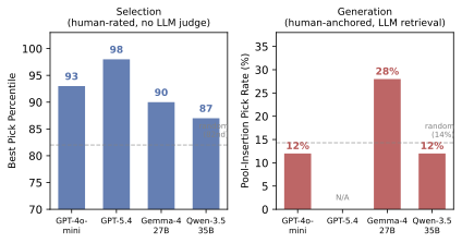 The human ratings of GPT-5.4's picks landed at the 98th percentile. GPT-4o-mini hit the 93rd. Open-source Gemma-4 27B reached the 90th, and Qwen-3.5 35B the 87th. Random selection still yields the 82nd percentile -- since it's best-of-3. But every model significantly exceeded random.