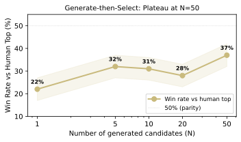Third, closing the gap. Currently AI selects well but generates poorly. If so, a system where humans propose and AI selects -- or where AI generates in bulk and humans curate -- could outperform either alone. The observation that generate-then-select plateaus at 37% around N=50 implies that without changing the generation distribution itself, search alone has limits.